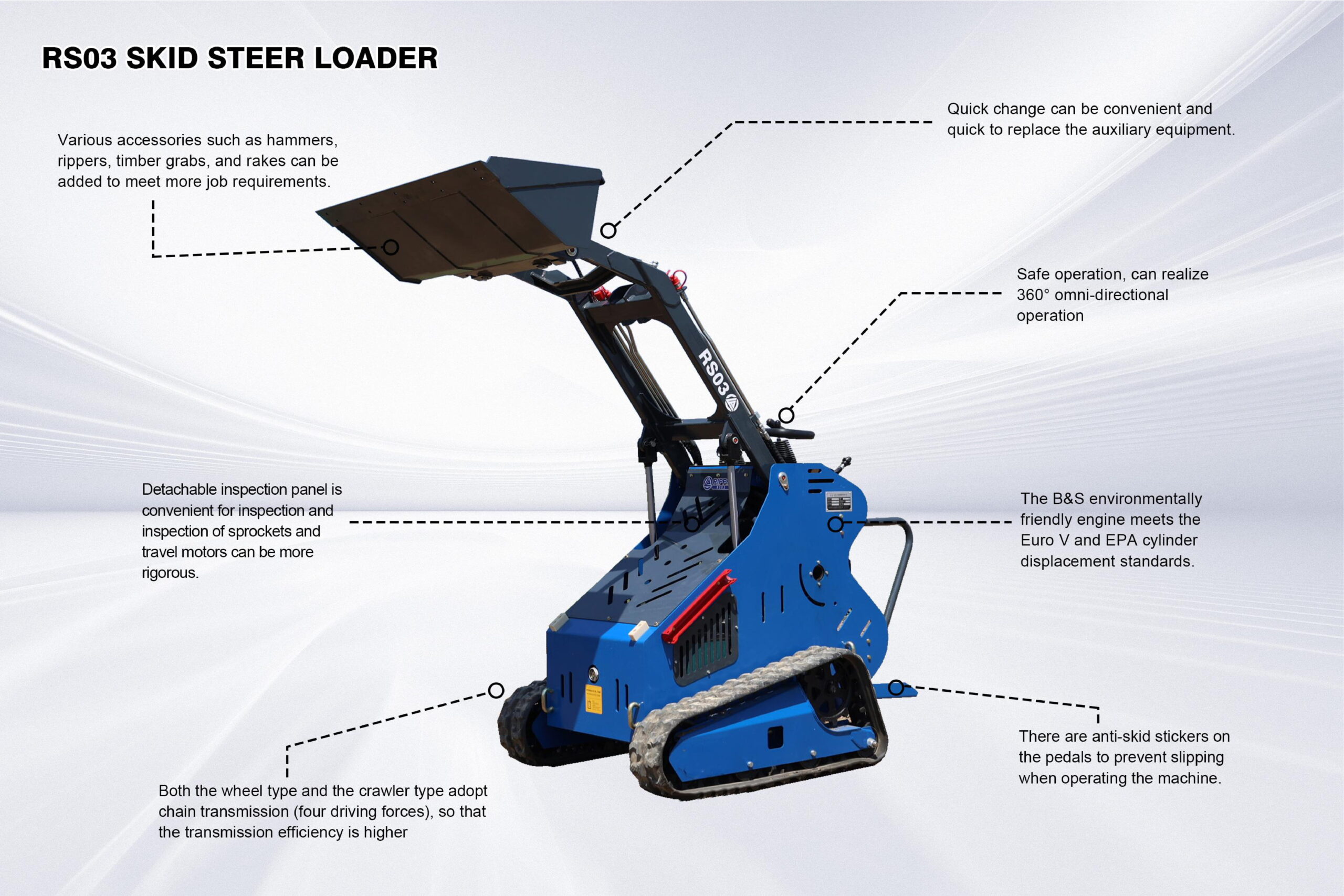 The RIPPA RS03 Skid Steer Loader is a compact, versatile, and powerful tracked loader designed for high efficiency in tight spaces.