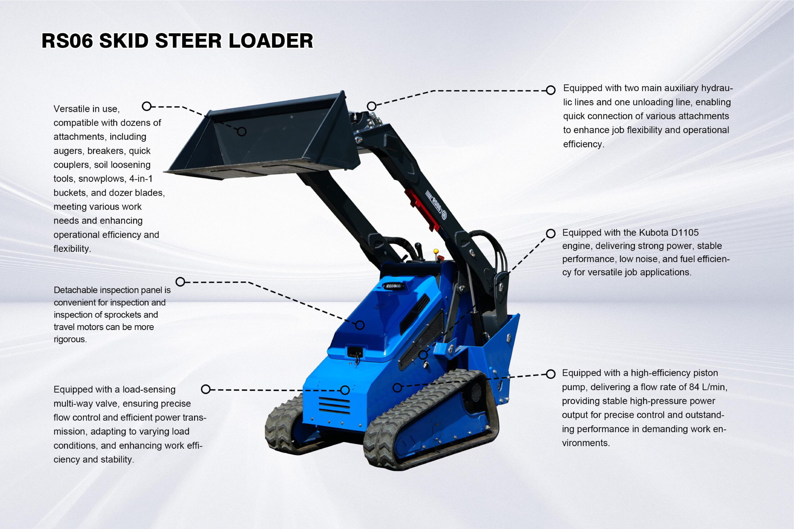 The RIPPA RS06 Skid Steer Loader is a compact, high-power tracked loader driven by the