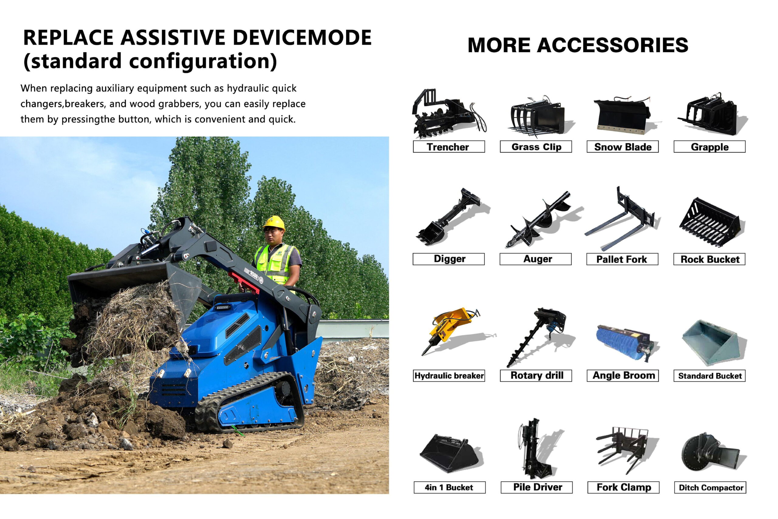 - Attachments: Trencher, breaker, auger, 4-in-1 bucket, pallet fork, rock bucket, etc.